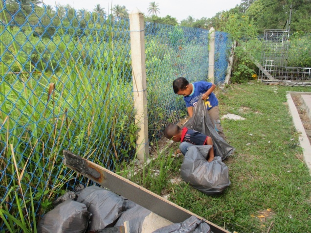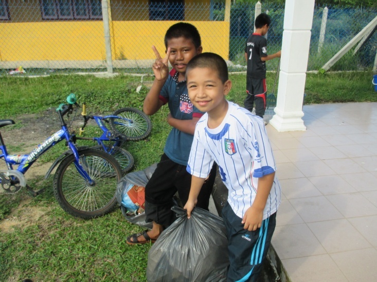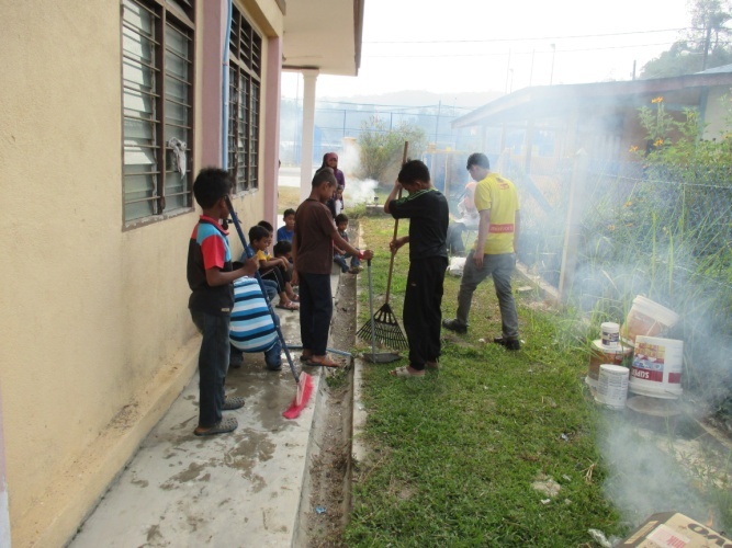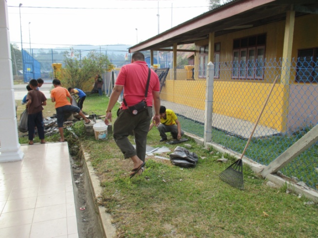 • Peserta membersihkan kawasan luar sambil dibantu oleh kakitangan bertugas.