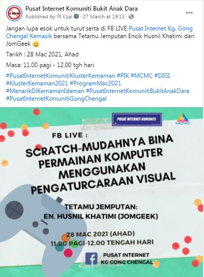 Facebook Live Pusat Internet Komuniti Kg Gong Chengal yang dikongsikan oleh 12 PIK Kemaman